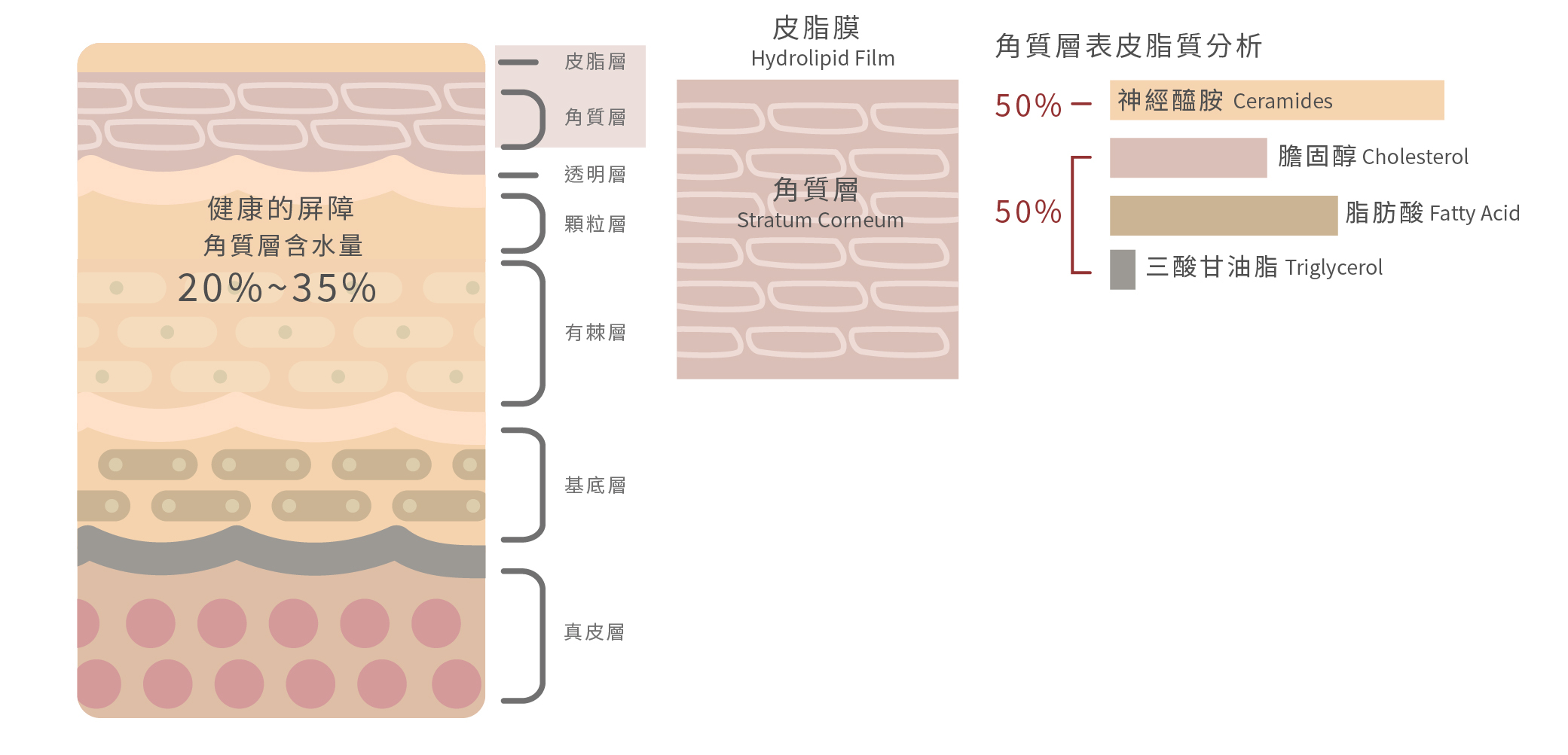 「皮膚」是人體面積最大的器官,由外而內依序是表皮層、真皮層、皮下組織。角質層位於表皮層的最外層。「肌膚屏障」就是由角質層,和角質層外的皮脂膜組成的,是人體與外部環境接觸的第一道防線,如同一面堅固的水泥牆面。健康的肌膚屏障能抵擋細菌和病原體的入侵,並鎖住水份,避免皮膚內的水份流失。